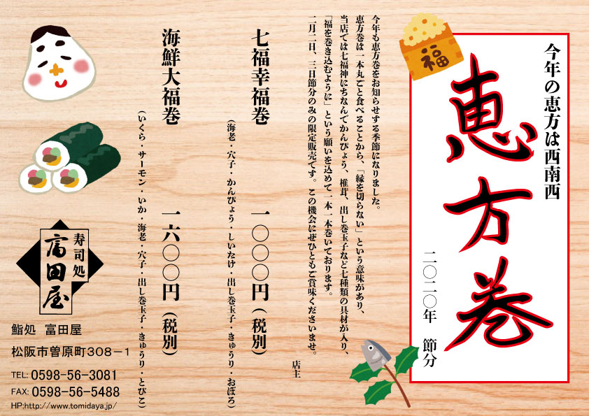 恵方巻 2020年 今年も恵方巻の季節がやってまいりました。今年の恵方は西南西です。無病息災、家内安全、一年間の福を願ってぜひとも今年も恵方巻を!2月2日、2月3日の限定販売です。ご予約お待ちしております。 投稿ナビゲーション Previous post 年末年始の営業についてNext post ひなまつりのお寿司2020