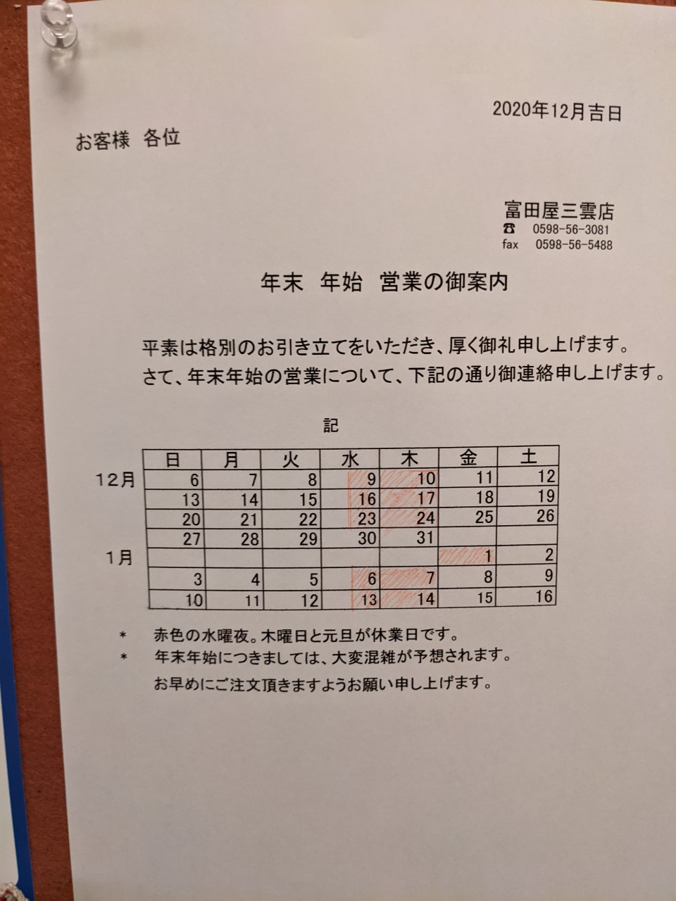 年末年始の営業について 12月30日(水) 12月31日(木)夜18:00まで 営業致します。 1月1日(元旦)休業 1月2日(土)から通常営業致します。 出前、テイクアウト、ご予約はお早めによろしくお願いいたします。 投稿ナビゲーション Previous post 臨時休業のお知らせNext post 恵方巻2021