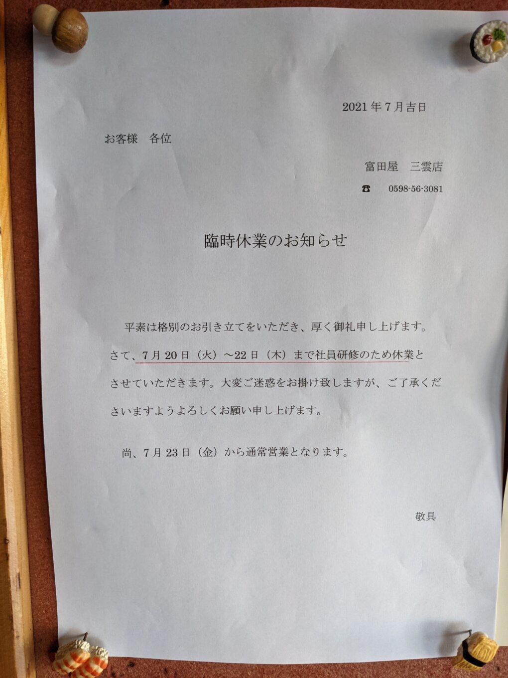 臨時休業のお知らせ 令和3年7月20日(火)~22日(木)は休業させていただきます。 大変ご迷惑をおかけ致しますがご了承いただきますようよろしくお願い申し上げます。 投稿ナビゲーション Previous post 松阪みんなの商品券ご利用いただけますNext post Go to Eat キャンペーン食事券再発売のお知らせ
