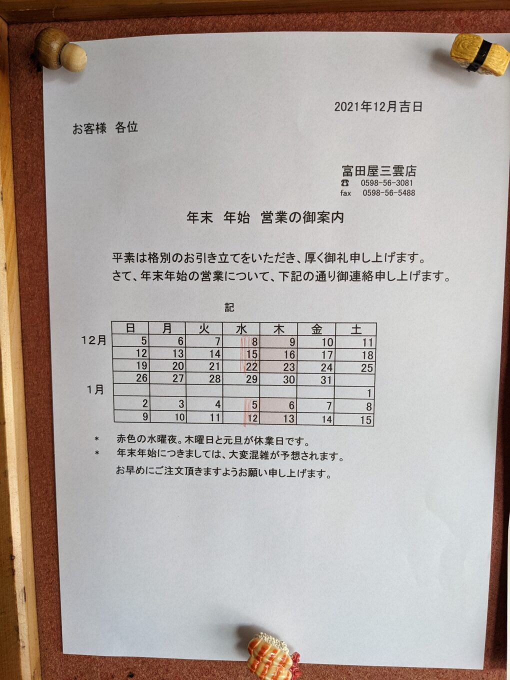 年末年始の営業について 下記のとうり年末年始は営業させて頂きます。(赤印が休業) 29日、30日は営業致します。 12月31日 18:00閉店 1月1日 休業 水曜日夜、木曜定休日 ※期間中混雑が予想されますので、早めのご注文をよろしくお願い致します。 投稿ナビゲーション Previous post 9月23日(祝)は営業致しますNext post 恵方巻2022