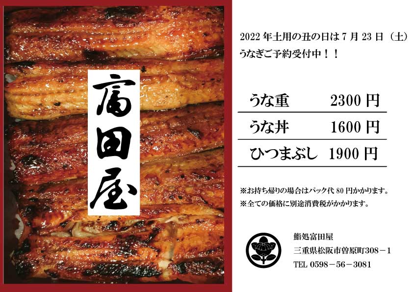 2022土用の丑 2022年の土用の丑の日は7月23日(土)です。今年は2回あるようで、8月4日(木)も土用の丑の日だそうです。 一年の中で一番暑さが厳しい時、うなぎを食べてスタミナをつけようという古くからの習わしです。 富田屋では下記のうなぎメニューをご用意しております。お持ち帰りの場合はパック代80円かかります。 ご予約お待ちしております。 投稿ナビゲーション Previous post 休業日のお知らせNext post お盆営業について